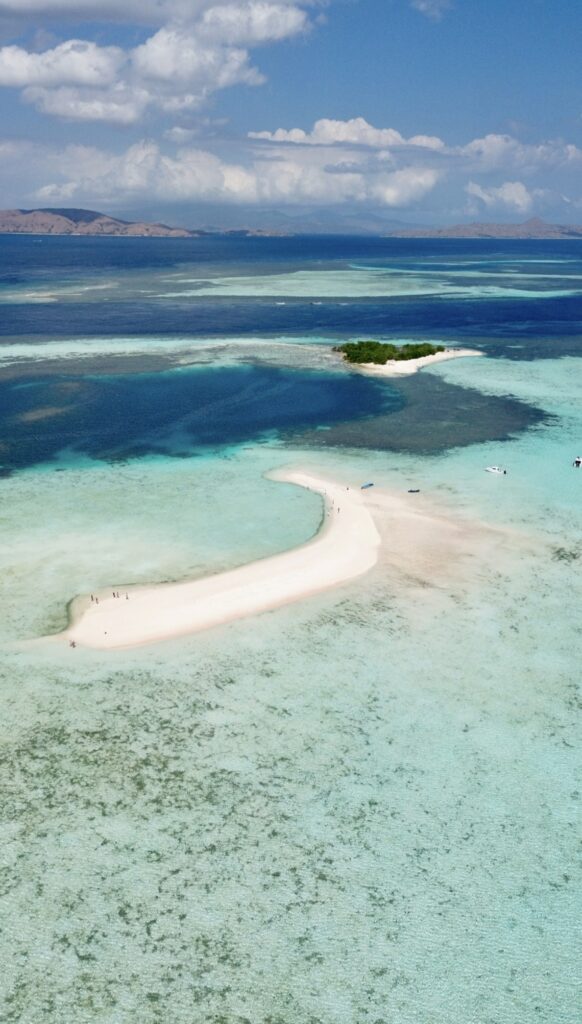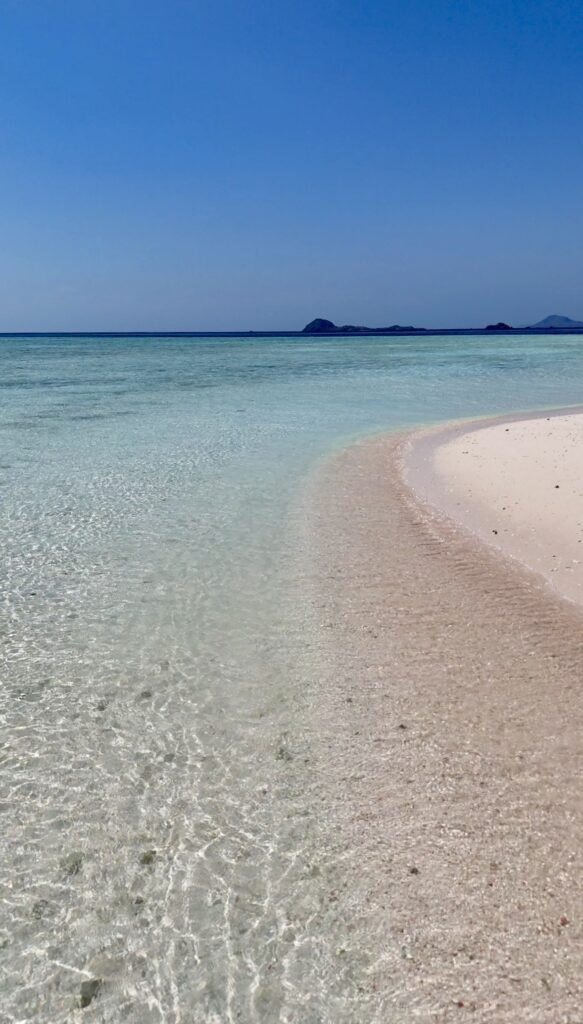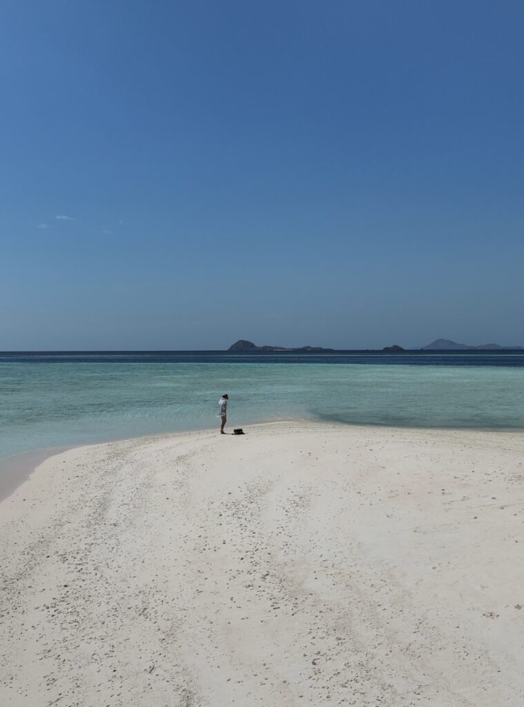 Taka Makassar Sandbar is barely an island, just a crescent of white sand floating in shallow, crystal-clear turquoise water.