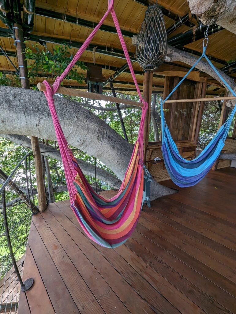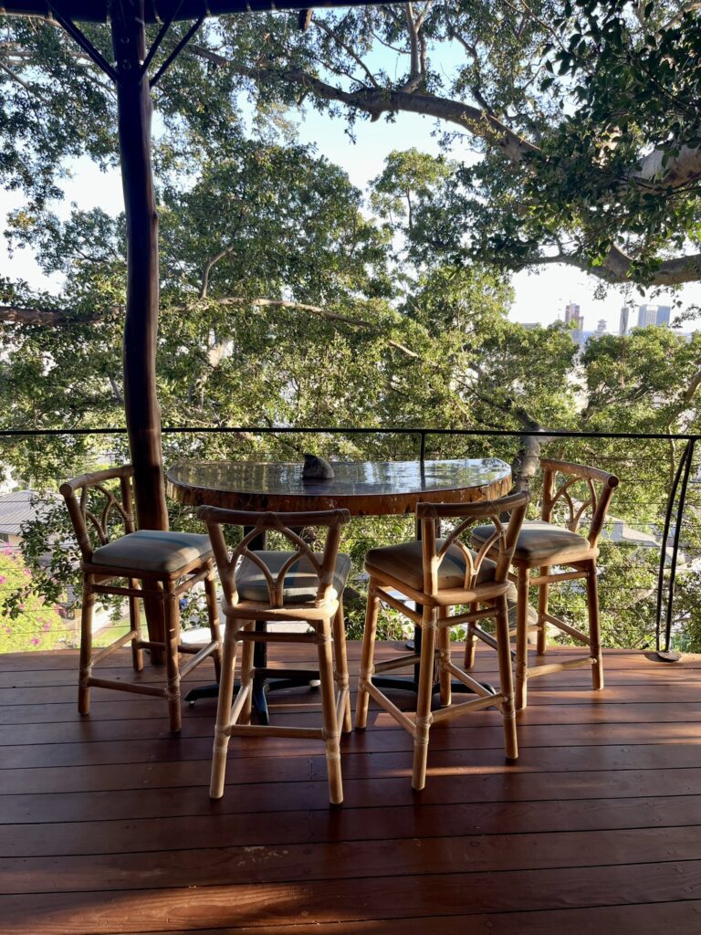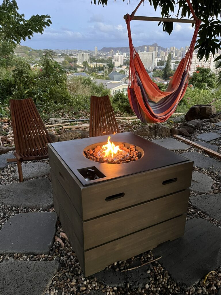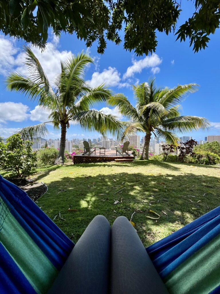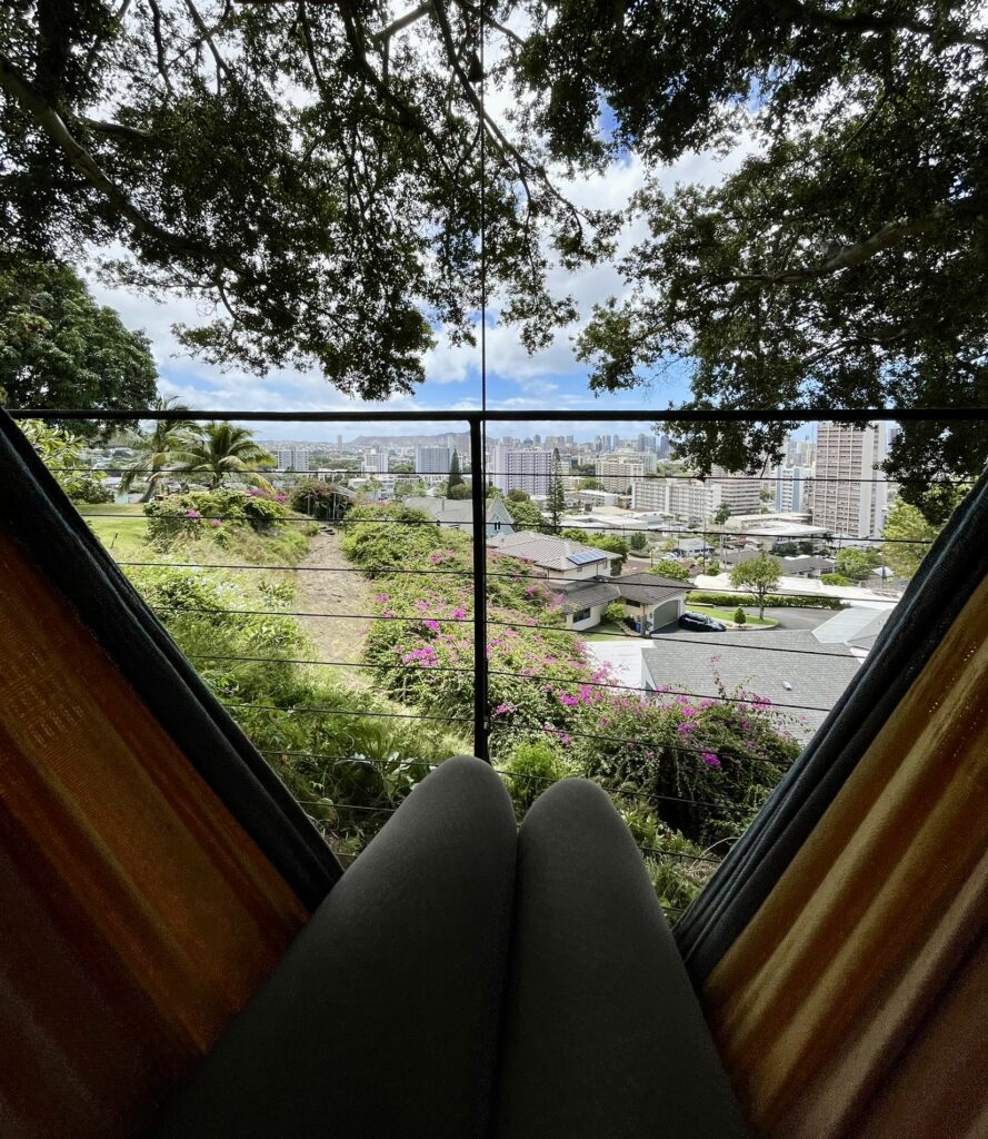 The layout of this tri-level treehouse in Hawaii is well-designed. The first floor is all open air. It has a fully equipped, modern kitchen with bar seating. There is also a lounge area with hammock chairs that overlook a portion of the Honolulu skyline. This is where I watched Waikiki’s Friday night fireworks during the first evening of my stay. (Yes! You can see the Waikiki fireworks from the treehouse!)